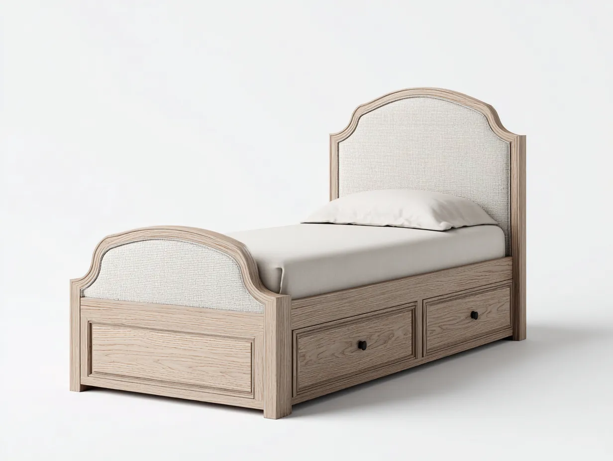 Dieses Einzelbett im klassischen Landhausstil verbindet eine ruhige Formgebung mit praktischer Funktionalität für Schlafräume, Gästezimmer oder Jugendzimmer. Die geschwungen gestalteten Elemente am Kopf- und Fußteil verleihen dem Bett eine elegante Silhouette. Der integrierte Stauraum im Unterbau ergänzt die Schlaflösung sinnvoll und unterstützt eine geordnete Raumgestaltung.