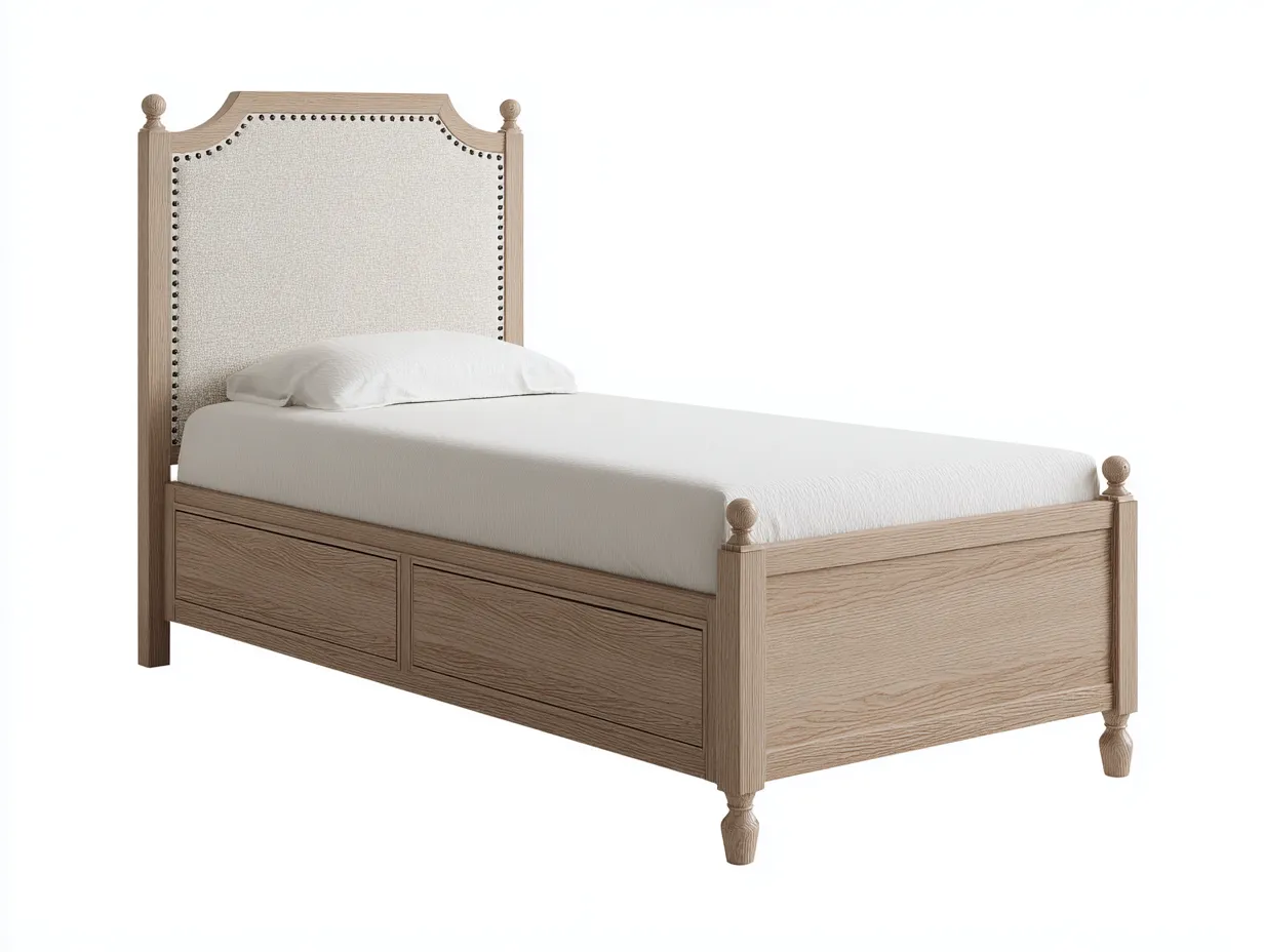 Dieses Einzelbett im klassischen Stil kombiniert eine elegante Form mit natürlicher Holzoptik und eignet sich für Schlafzimmer, Gästezimmer oder Jugendzimmer. Das hohe Kopfteil mit textiler Fläche sorgt für eine ruhige und harmonische Raumwirkung und ergänzt unterschiedliche Einrichtungsstile.