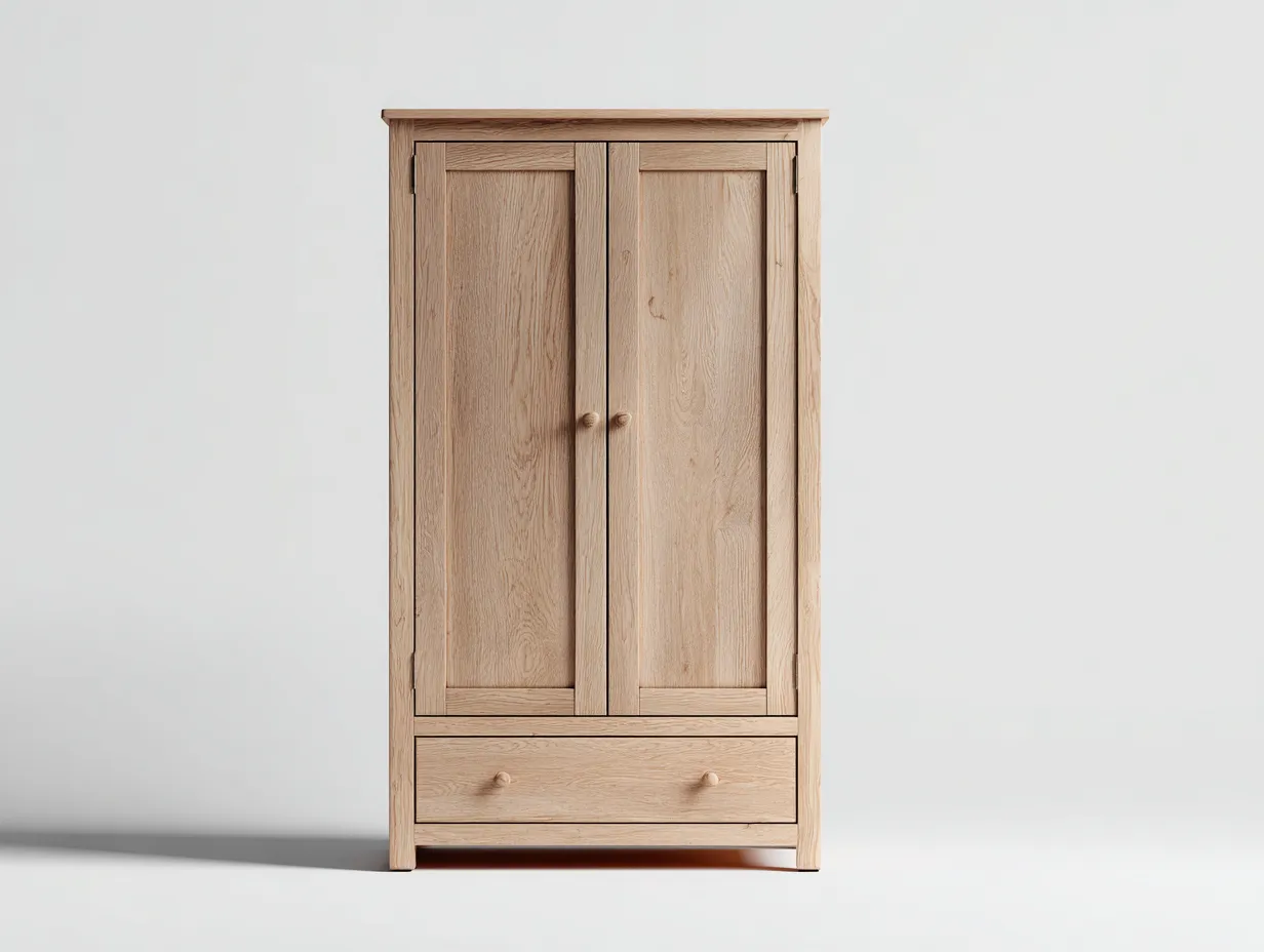 Gefertigt aus Eiche und in Naturfarbe gehalten, zeigt der Kleiderschrank eine charakteristische Holzmaserung, die dem Möbelstück einen authentischen Ausdruck verleiht. Die Oberfläche ist fein verarbeitet und angenehm glatt. Stabile Verbindungen sowie präzise bearbeitete Kanten sorgen für eine solide Konstruktion und eine langfristige Nutzung im Wohnbereich.