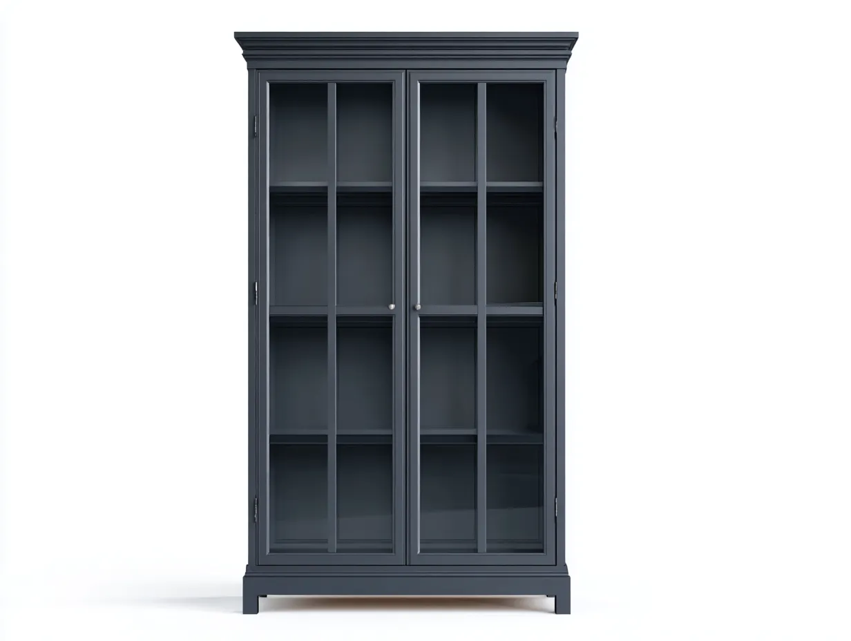Die Konstruktion besteht aus Holz und Glas und ist in Dunkelblau ausgeführt. Die Oberfläche ist gleichmäßig verarbeitet und unterstreicht die klassische Gestaltung des Möbels. Stabil ausgeführte Kanten und solide Verbindungen sorgen für eine zuverlässige Struktur, während die eingesetzten Glaselemente eine klare Präsentationsfläche schaffen.