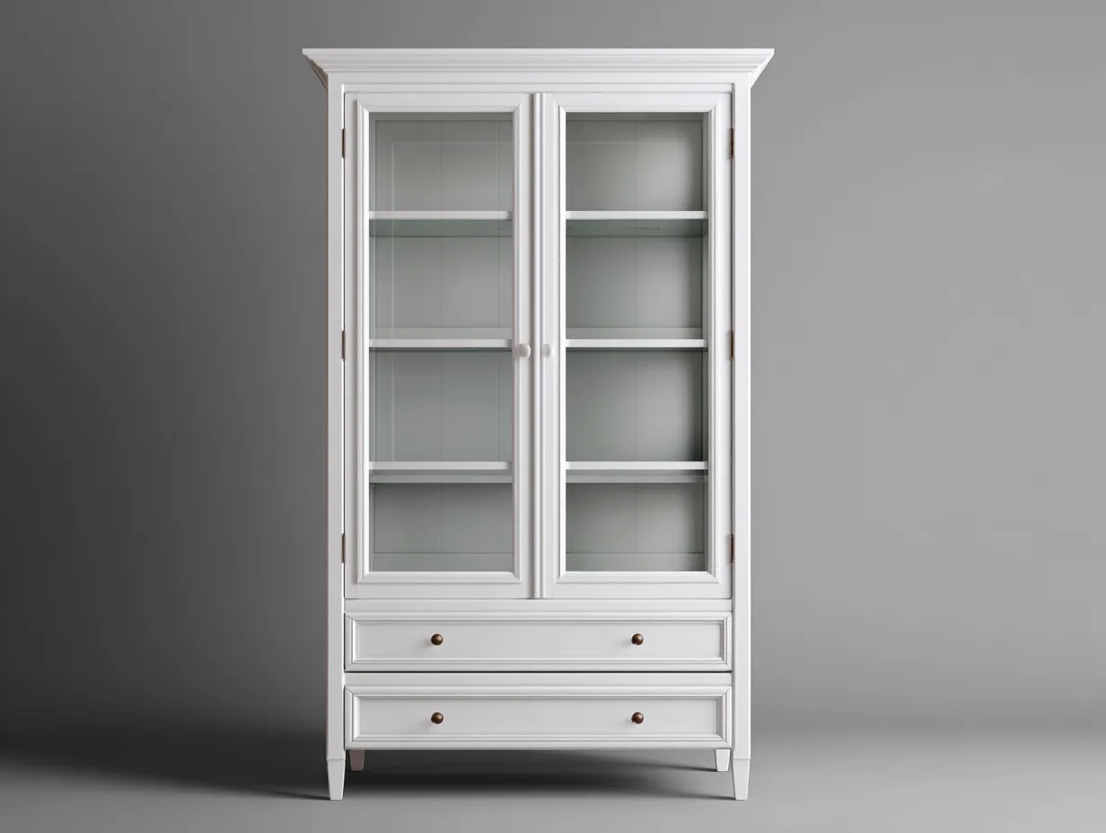 Gefertigt aus Holz und Glas und in Weiß ausgeführt, zeigt diese Vitrine eine gleichmäßige Oberfläche mit klassischer Anmutung. Die sorgfältig verarbeiteten Kanten und stabilen Verbindungen sorgen für eine zuverlässige Konstruktion. Die Glaselemente sind präzise eingesetzt und ermöglichen eine dauerhafte Nutzung im Küchenbereich.